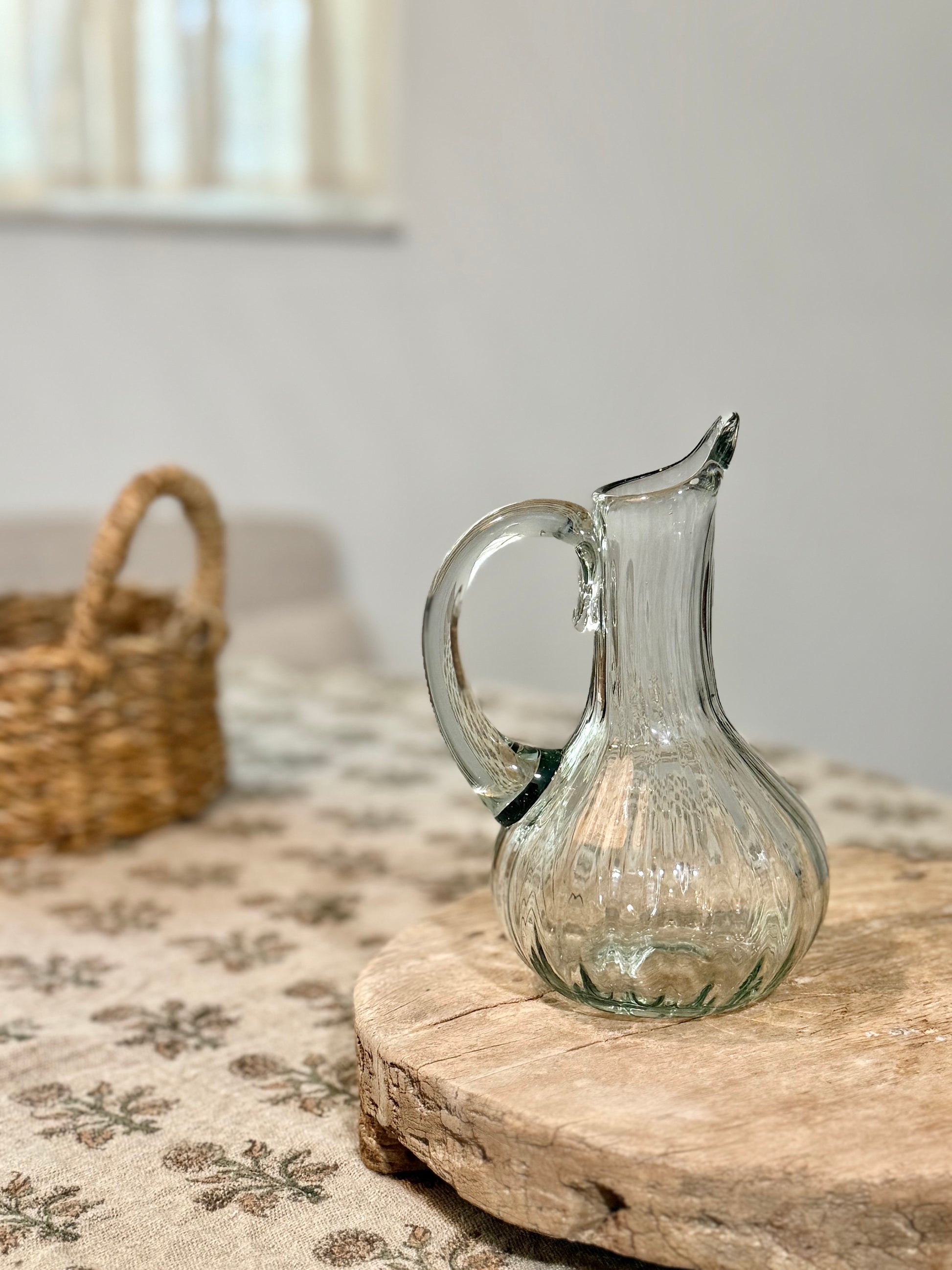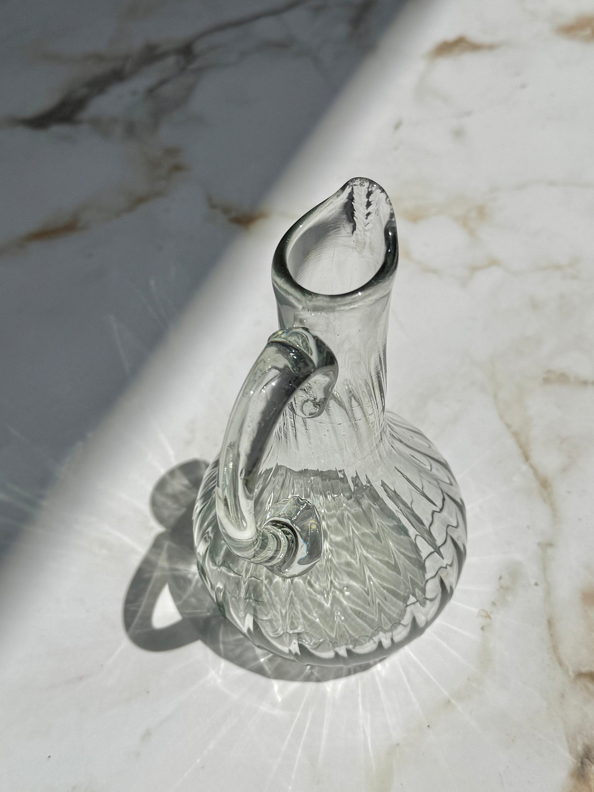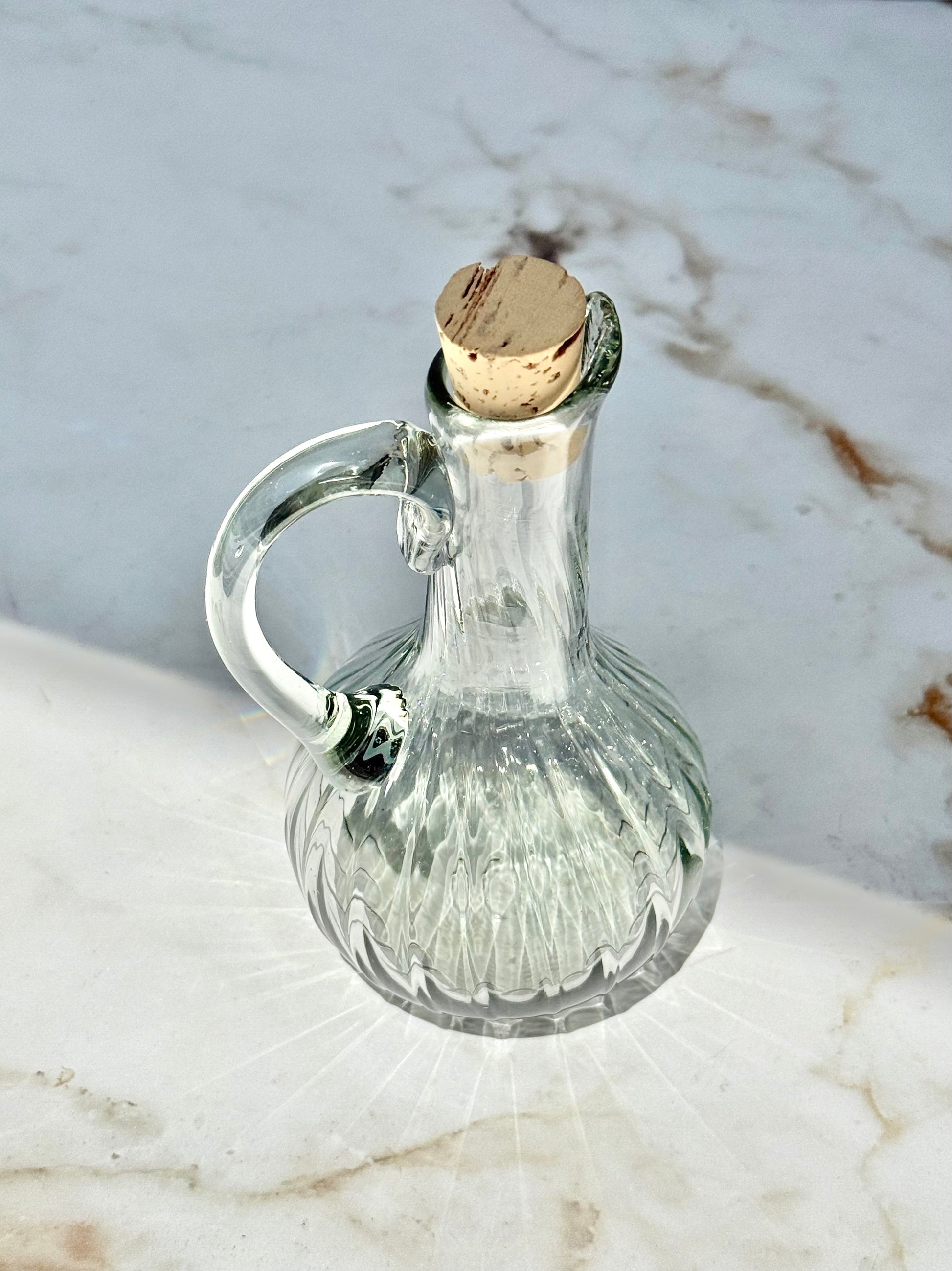 Crafted from 100% recycled glass, with its subtle ribbed texture and shape that calls to mind rustic Mediterranean antiques, this handblown cruet is a charming and practical addition to your kitchen.