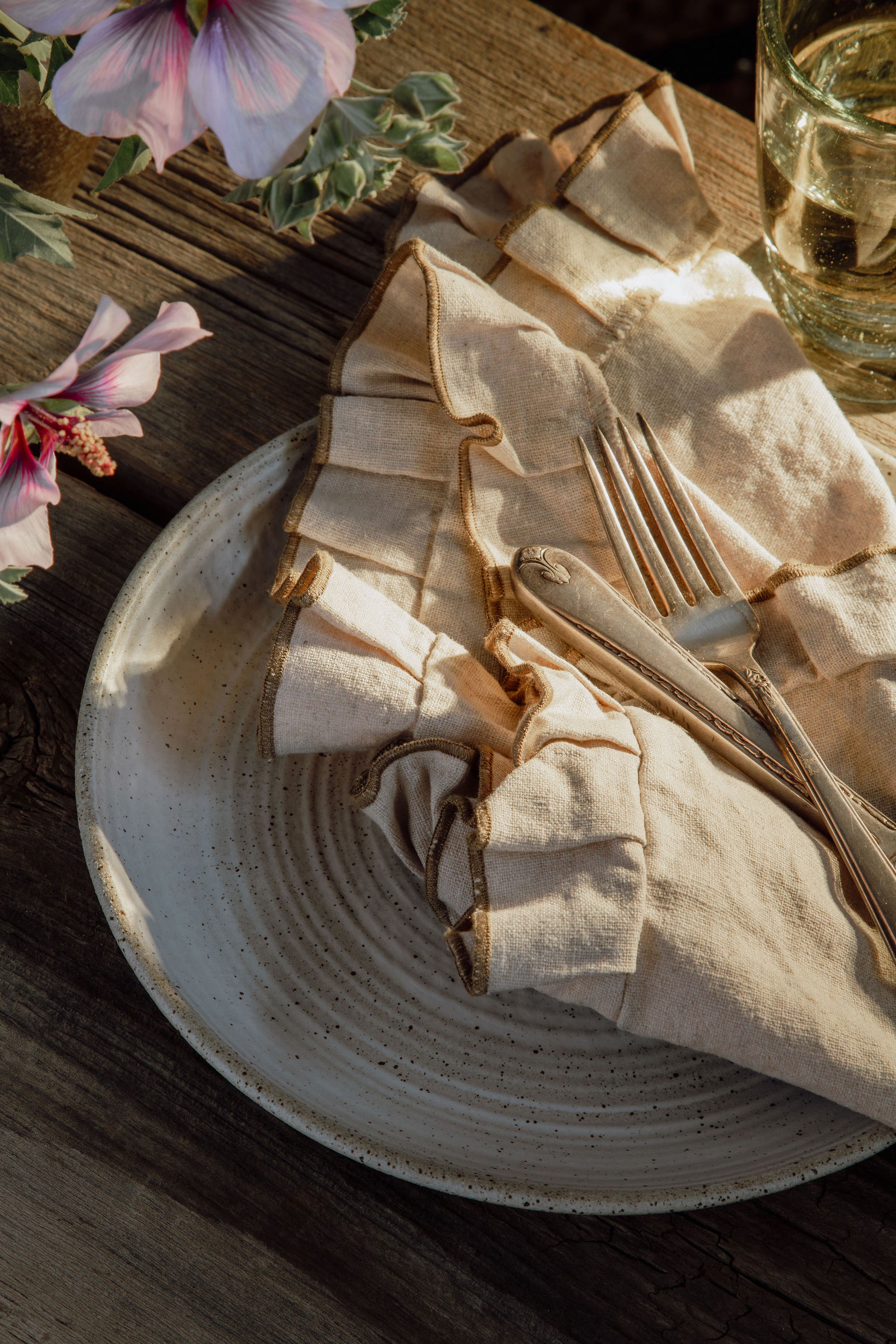 With a subtle olive green border, and a ruffled trim, these lovely napkins will offer timeless charm to your table settings.